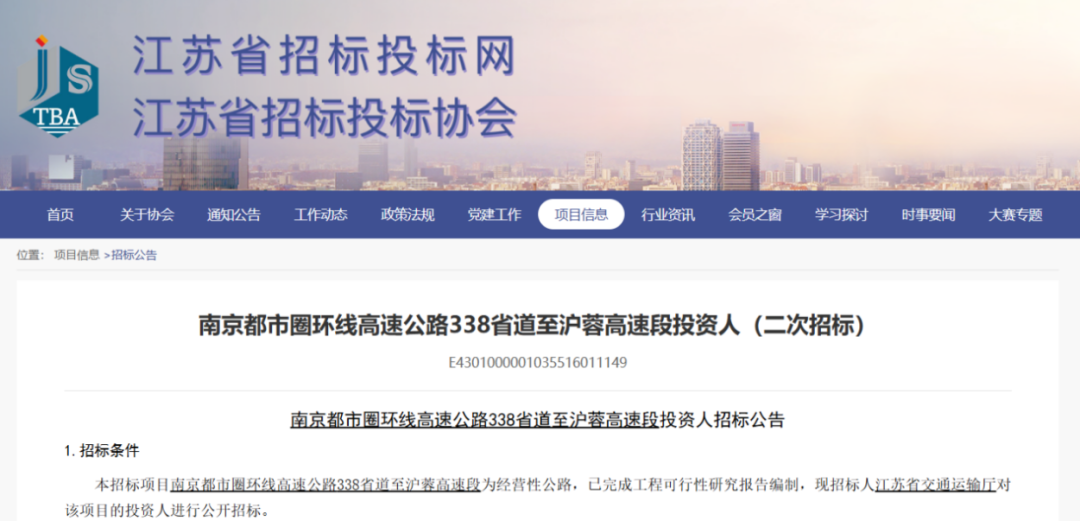 近日,南京都市圈环线高速公路338省道至沪蓉高速段投资人开始第二次招标,招标人为江苏省交通运输厅。